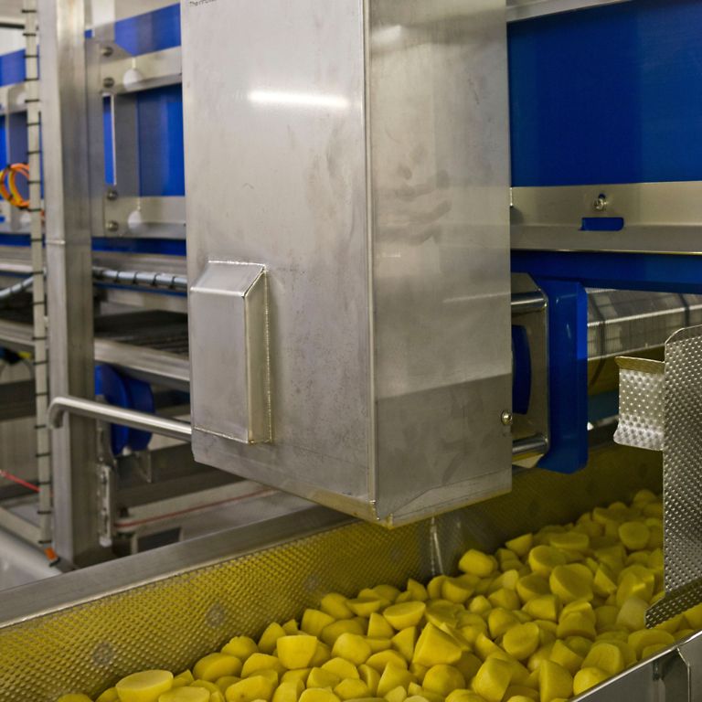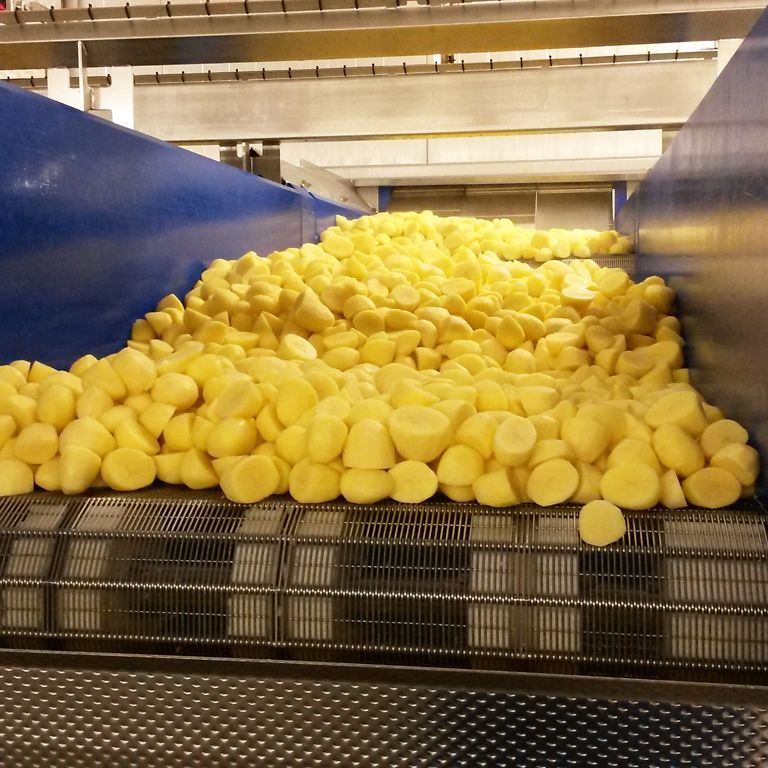 Das Sortieren der Kartoffeln sowie das Waschen und Schälen läuft größtenteils automatisch ab. In einer durchgehenden Förderstrecke werden die Erdäpfel von der Wäsche bis in den Kühltunnel geführt. Doch mit der vollständigen Kopplung des gesamten Prozesses gehen auch Herausforderungen an die Automatisierungstechniker der Firma Schaap einher. Wenn beispielsweise in der Verpackungsmaschine am Ende der Produktion ein Maschinenstopp verursacht wird, dann steht die gesamte Linie. Um das zu vermeiden, setzt Schaap Pufferbänder vor der Waage der Verpackung ein.