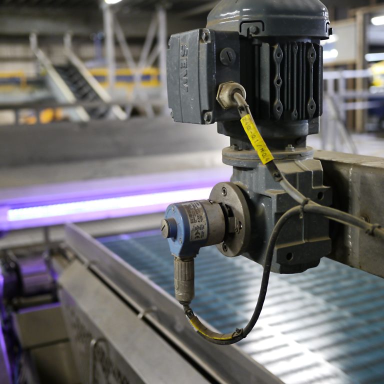 Das Ausgangssignal des QR24 legt van Raalte auf einen Standardeingang der SPS, einer Siemens S7 1500. Parametriert hat er den Drehgeber über das Parametrierungsprogramm Pactware am PC. Über TURCKs Easy-Teach-Aadapter können zwar auch an der Anlage neun voreingestellte Werte ausgewählt werden, allerdings liegen diese häufig verwendeten Werte zwischen 360 und 5.000 Impulsen pro Umdrehung. Per Pactware können frei 1 bis 5.000 Impulse pro Umdrehung ausgewählt werden. Die Ausgabe von zwölf Impulsen pro Umdrehung wählte Schaap, weil das folgende Förderband mit sechs Impulsen pro Umdrehung erfasst wird. Die Umrechnung fällt so leichter. TURCKs Drehgeber ist unter einer Schutzabdeckung aus Metall am Motor angebracht. Mit dem QR24 in Edelstahl bietet TURCK seit kurzem auch eine besonders robuste Lösung an, die in der Lebensmittelindustrie ohne Schutzmaßnahmen verbaut werden kann. In der Kartoffelproduktion sprühen die Schaap-Mitarbeiter jede Woche die gesamte Anlage mit einem Reinigungsschaum ein, der nach einer Einwirkzeit von 20 Minuten mit 15 Bar Druck abgespritzt wird. Anschließend wird die gesamte Anlage noch zusätzlich desinfiziert.