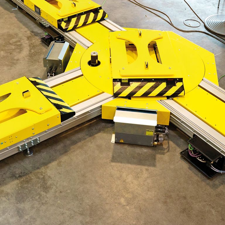 Um nicht mit jeder Anlage das Rad neu erfinden zu müssen, setzt Krups auf ein modulares Konzept. Das System besteht aus wenigen standardisierten Modulen: Drehmodule, Quershuttle, Stopper und Indexierer. Diese Einheiten werden für die Anforderungen des Kunden individuell zu einem Layout zusammengestellt und vor Ort an dessen Anlagensteuerung angebunden. Das Fördersystem liefert dem Produktionssystem des Kunden Reportdaten und ermöglicht bidirektionale Kommunikationsschnittstellen.
