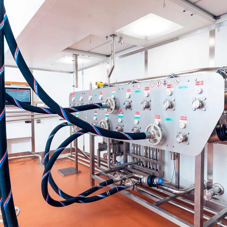 Der Kernprozess der neuen Anlagen umfasst im Wesentlichen die Zuführung der verschiedenen chemischen Rohstoffe von den Wiegecontainern in die Mischtanks und die Weiterleitung der Fertigprodukte in die Abfülllinie. Knotenpunkte im System sind zwei Schlauchbahnhöfe, von denen der eine bei der Aufgabestation und der andere an der Schnittstelle zur Abfülllinie platziert ist. Im Prozess müssen die Schläuche je Charge drei- bis viermal versetzt werden. Damit es nicht zu Verwechslungen mit verhängnisvollen Auswirkungen kommt, sind die Schlauchbahnhöfe ins RFID-System eingebunden, das die gesamte Anlage kontrolliert. Bei jedem Anschluss müssen je ein RFID-Datenträger auf Schlauchseite und ein RFID-Schreib-Lese-Kopf als Gegenüber zusammenspielen. Der Durchlass öffnet sich nur dann, wenn das System das richtige Medium identifiziert hat.