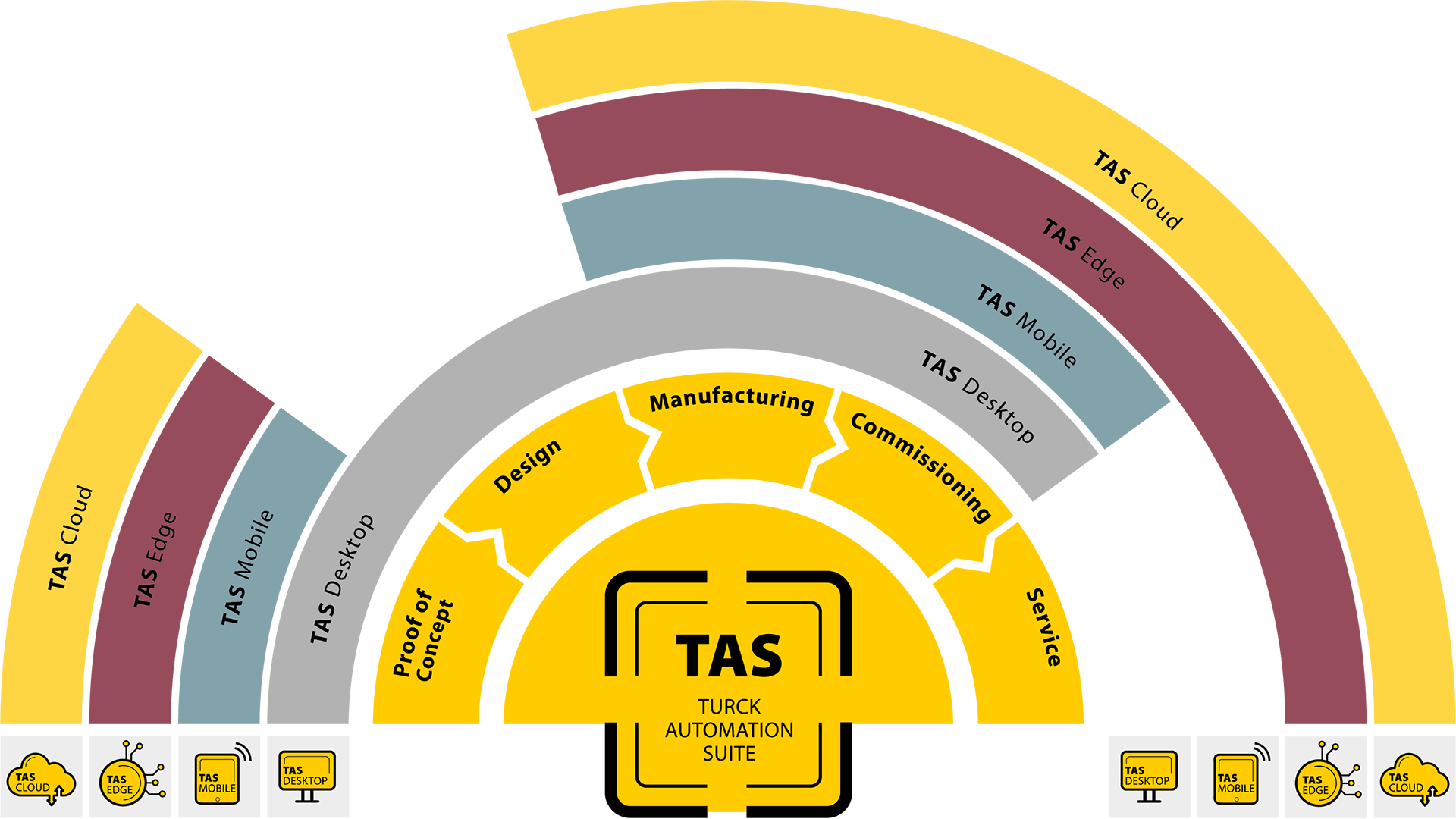Service: TAS Edge liefert kontinuierlich Betriebsdaten für Condition Monitoring und Predictive Analytics. TAS Cloud ermöglicht zusätzlich Alarming, Remote-Service, Streaming-Analysen und die Umsetzung eigener Service-Modelle.