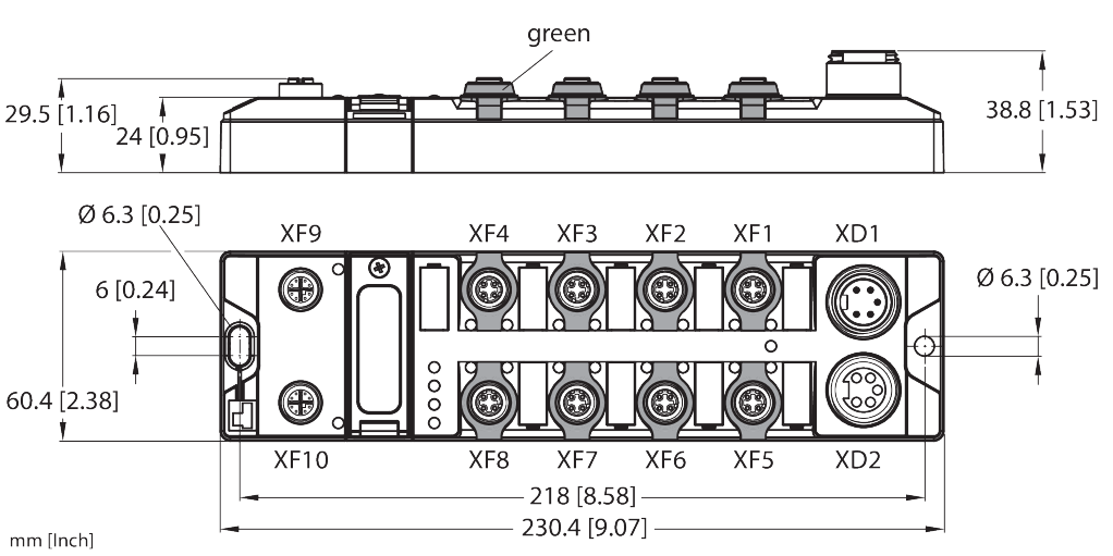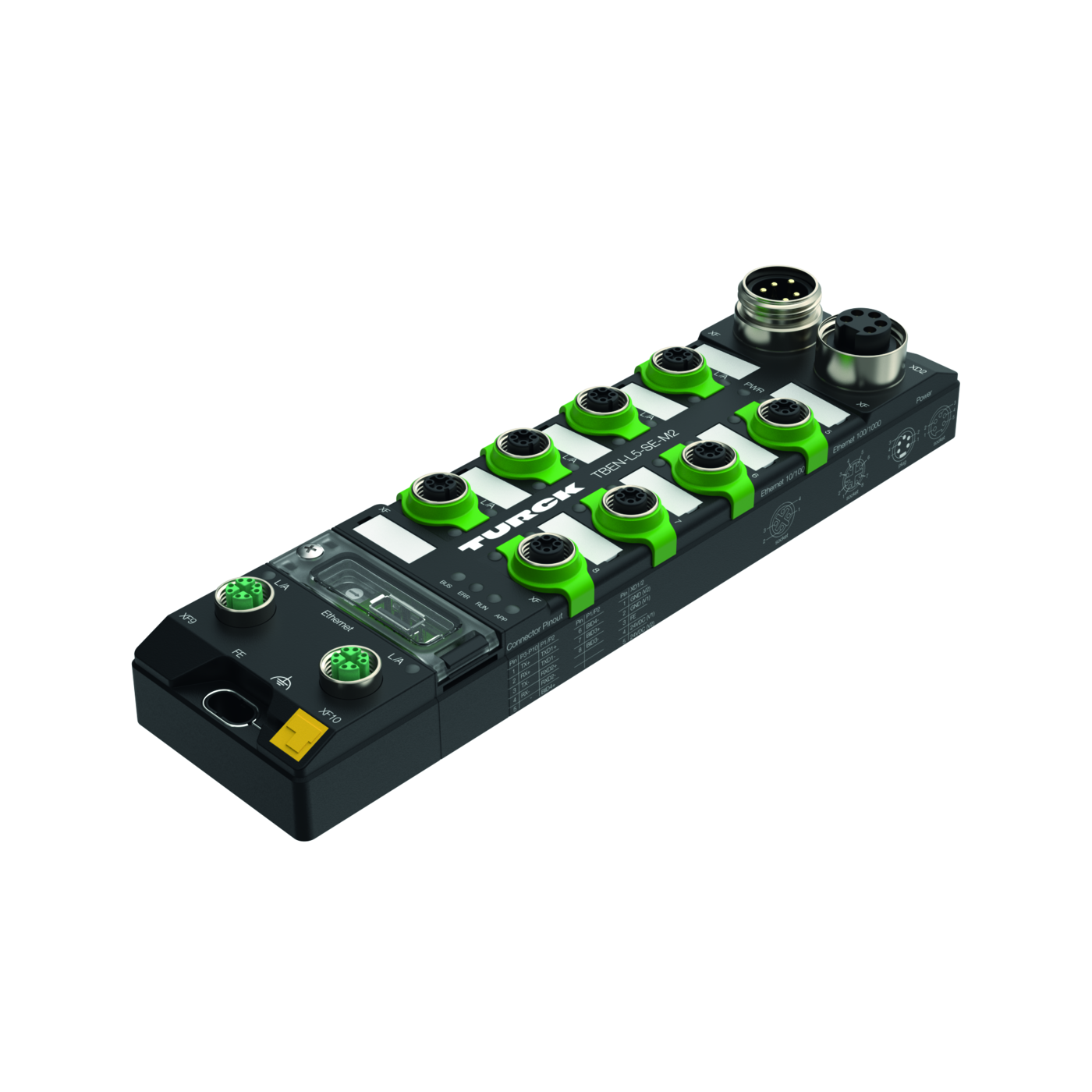 - 2 × M12, 8-pin, X-coded, 8 × M12, 4-pin, D-coded