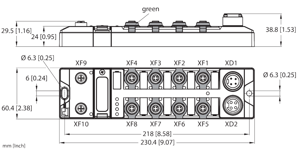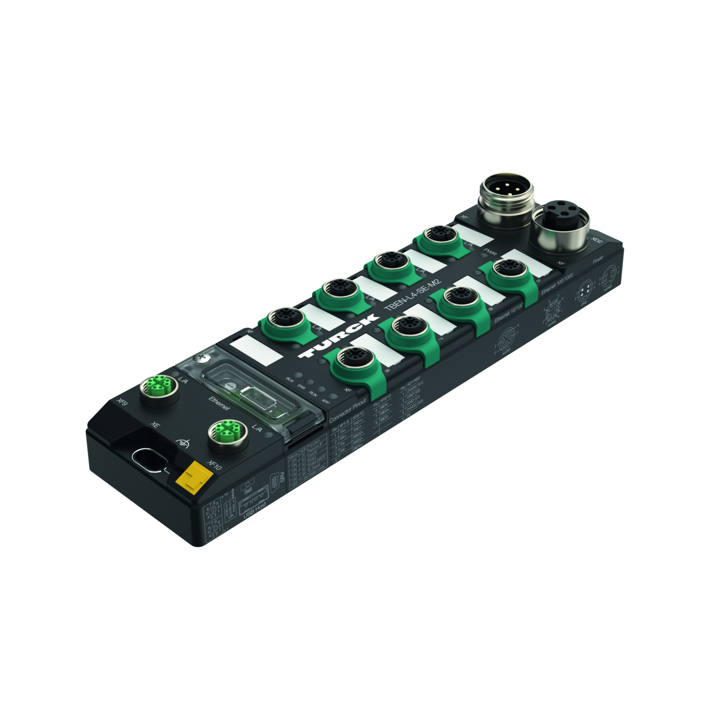 - 2 × M12, 8-pin, X-coded, 8 × M12, 4-pin, D-coded