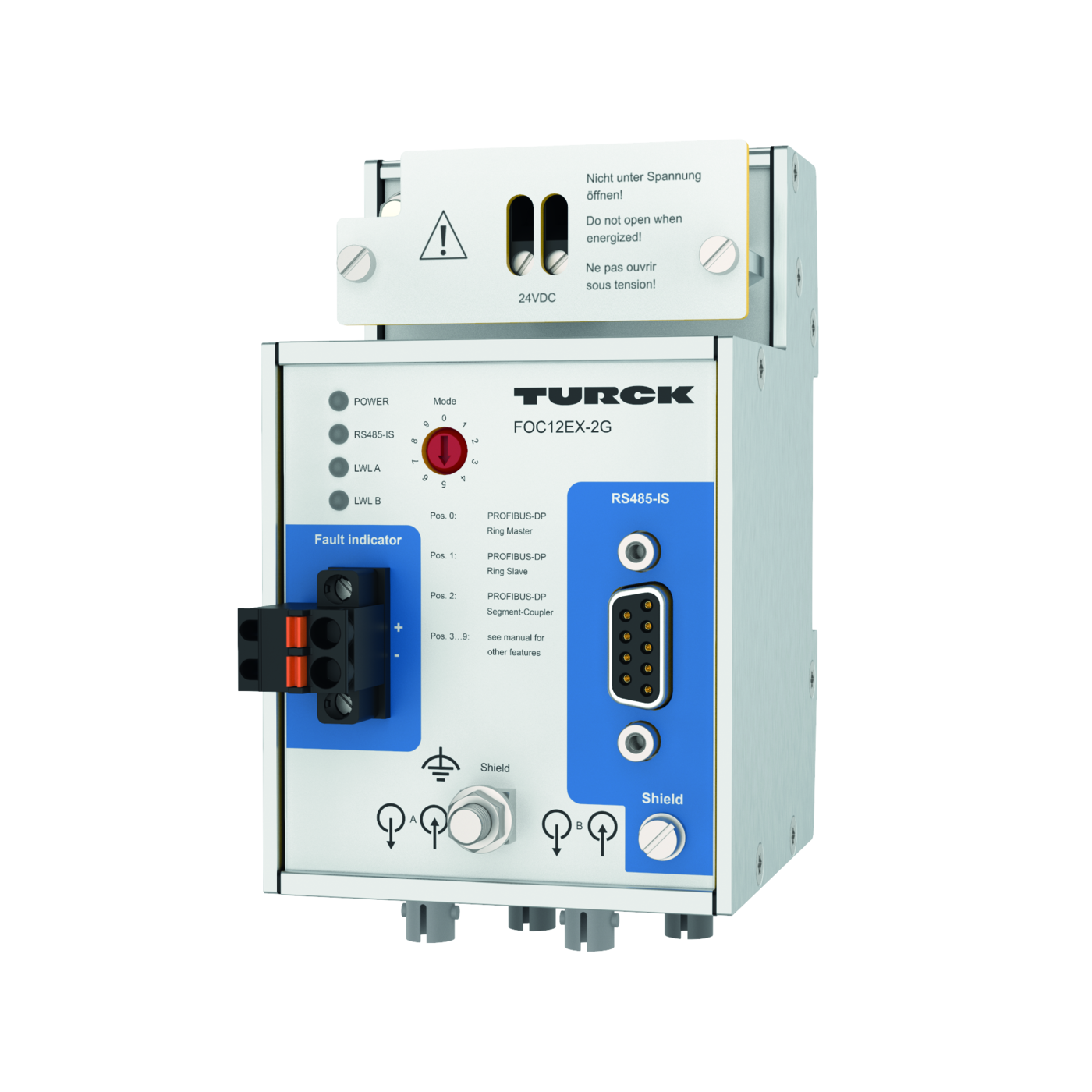 1 x Ex e terminal, 2-pin, screw connection, 1 x 2-pin removable terminal block, spring-type connection, 4 x BFOC/2.5 (St) male connector