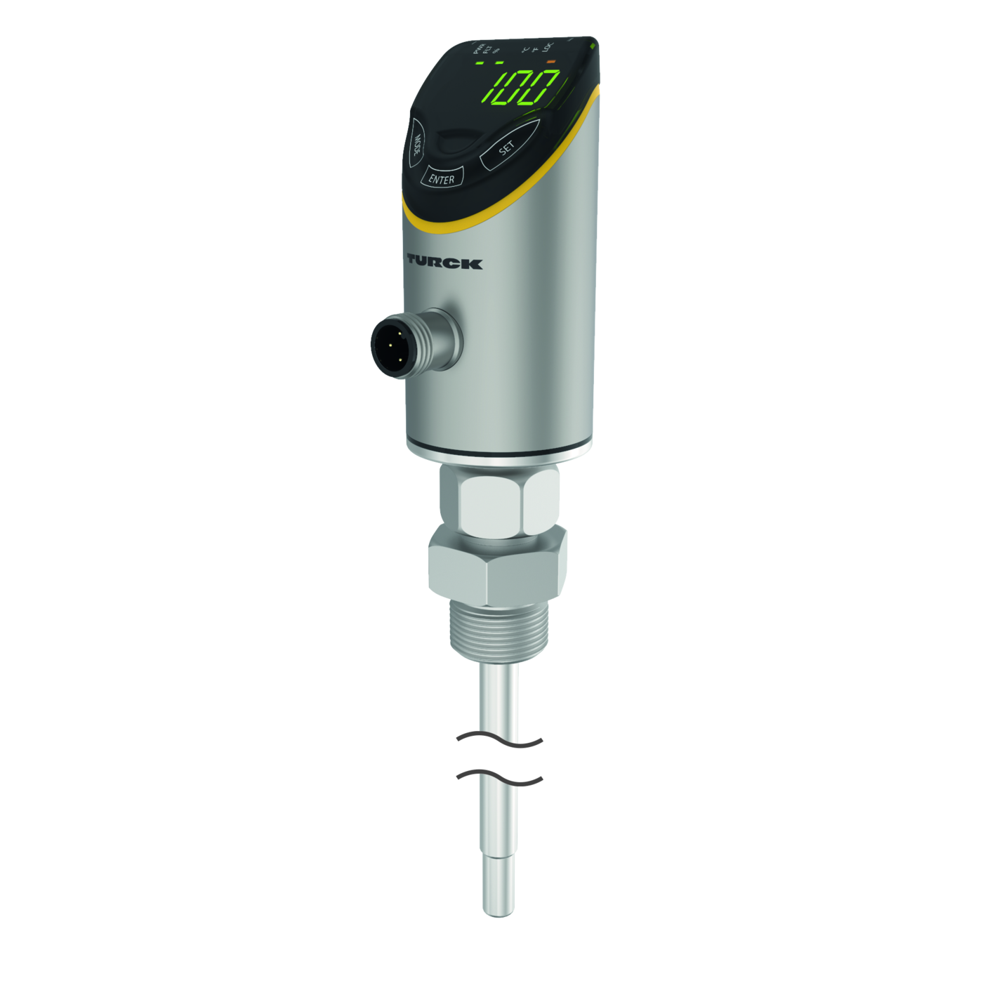 - LED display functions for status of supply voltage, switching states, units and teach processes. Process display via 12-segment display.
