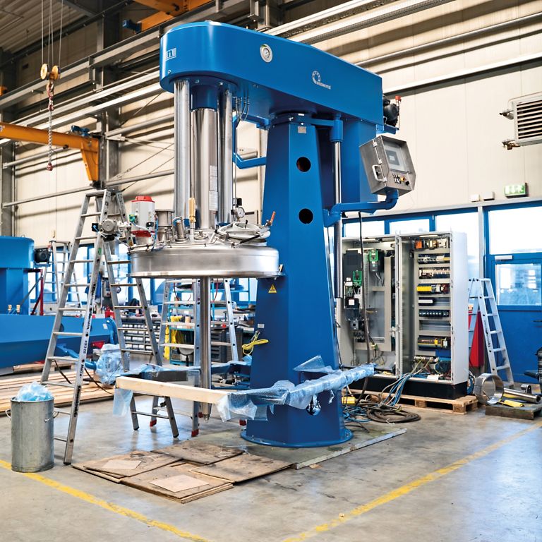 Depending on product requirements, customers select one of these basic machine types, but in practice place far more extensive demands on the machine design. The engineering office of the family-owned company must prepare its project drawings in accordance with the on-site conditions at the customer's facility, whether a 5000-liter vessel is required despite limited ceiling height, or the cooling circuit of the mixing vessel needs to be supplemented with a heating function to manufacture a specific product. In addition, Niemann supplies its dissolvers either in a standard version or as a mounted version for installation on steel platforms or intermediate floors.
